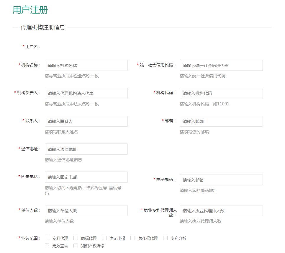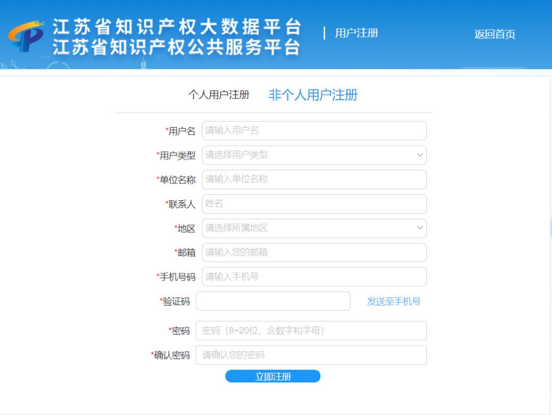 2. 若为首次登录,需注册非个人用户,按照实际情况选择用户类型,其中代理机构用户类型选择为服务机构,创新主体根据自身情况选择企业、高校科研院所、行业协会或其他组织。