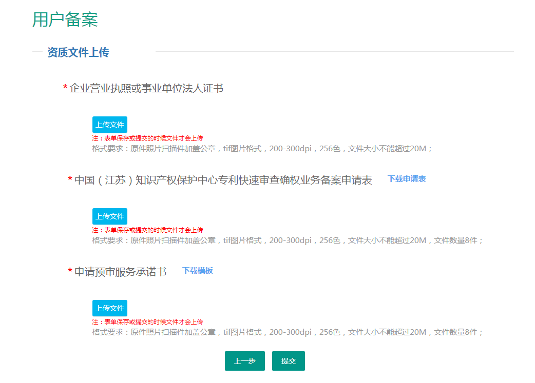 4.1 创新主体填写用户备案信息,点击“下一步”上传企业营业执照或事业单位法人证书扫描件(加盖公章)、中国(江苏)知识产权保护中心专利快速审查确权业务备案申请表(加盖公章)以及申请预审服务承诺书(加盖公章)等资质文件后,提交备案申请。备案界面如下图所示。