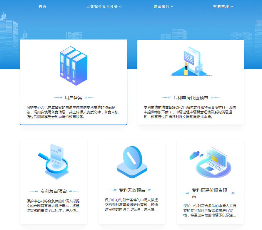 中心快速预审服务实现无纸化、不见面办公,注册、备案和预审申请将均可在“江苏省知识产权大数据平台专利预审系统”在线提交。创新主体备案和代理机构注册功能具体操作步骤如下: