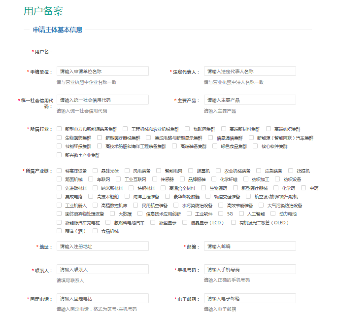 3. 用户审核通过后,使用该注册用户登陆平台,进入用户备案页面。(一小时内审核完毕,注册手机号会收到短信提醒)