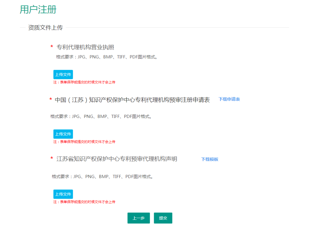 4.2 代理机构填写注册信息,点击“下一步”上传专利代理机构营业执照扫描件(加盖公章)、中国(江苏)知识产权保护中心专利代理机构预审注册申请表(加盖公章)以及中国(江苏)知识产权保护中心专利预审代理机构声明(加盖公章)等资质文件后,提交注册申请。注册界面如下图所示。