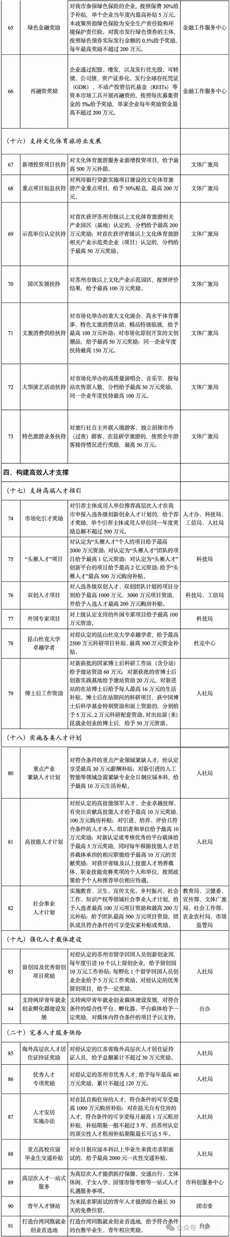 (十九)强化人才载体建设。对经认定的苏州市留学回国人员创新创业园,每年度引进10个以上留创企业,给予留创园10万元工作补贴;每孵化1个留学回国人员创业企业给予5万元工作奖励。对经认定的优秀留创项目,给予一定奖励。支持两岸青年就业创业载体建设发展,对符合条件的综合性平台、孵化器、平台载体给予一定奖励,对载体内符合条件的项目予以支持。(责任单位:市委人才办、市人社局、市委台办)